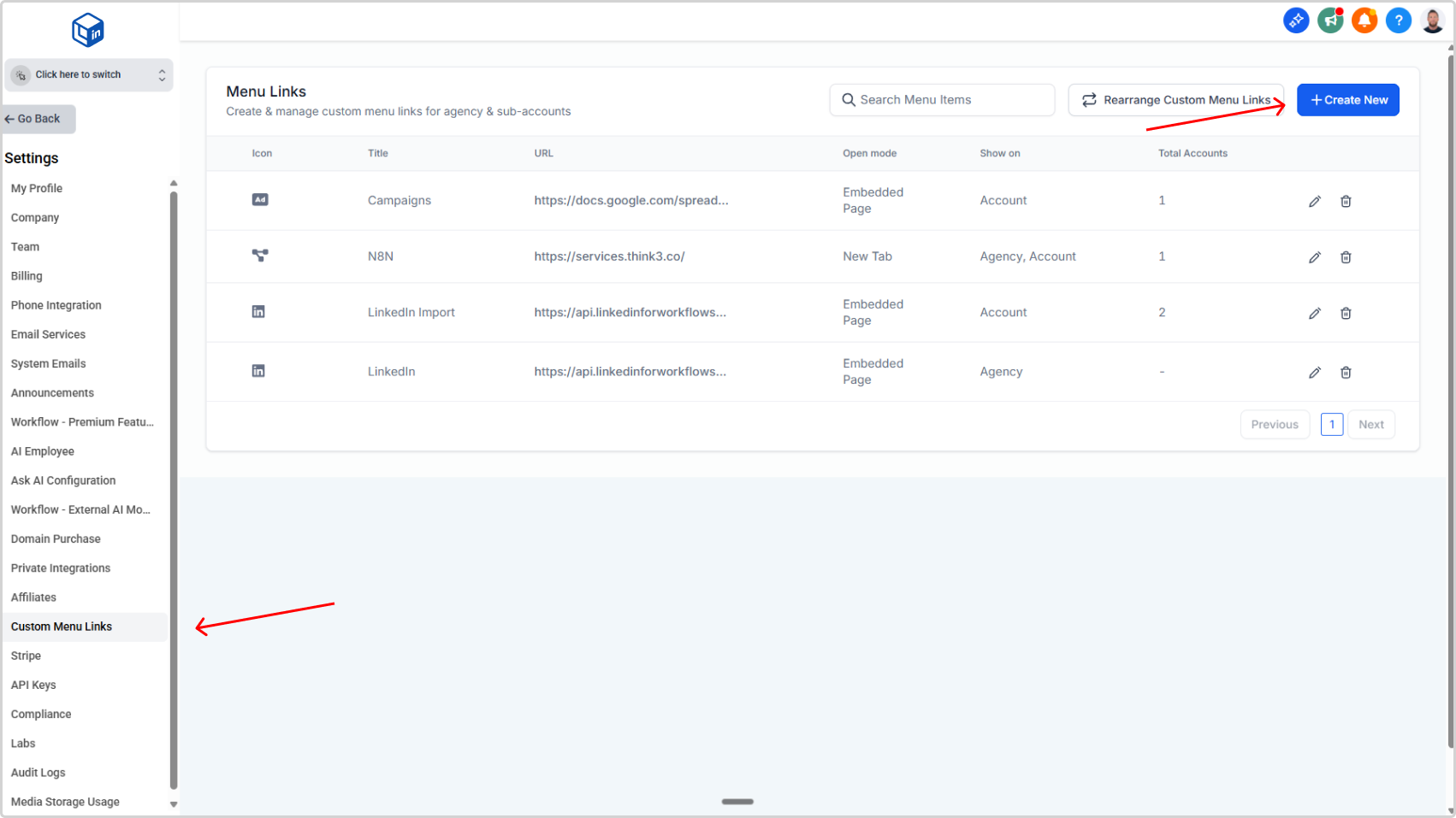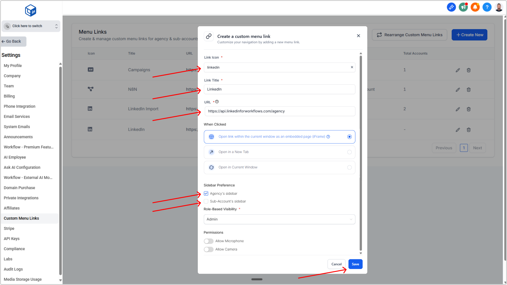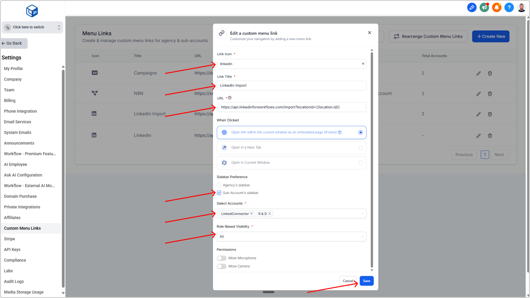 Add LinkedConnector menu links to your agency and sub-account dashboards so users can access the LinkedIn dashboard and importer without leaving the CRM.