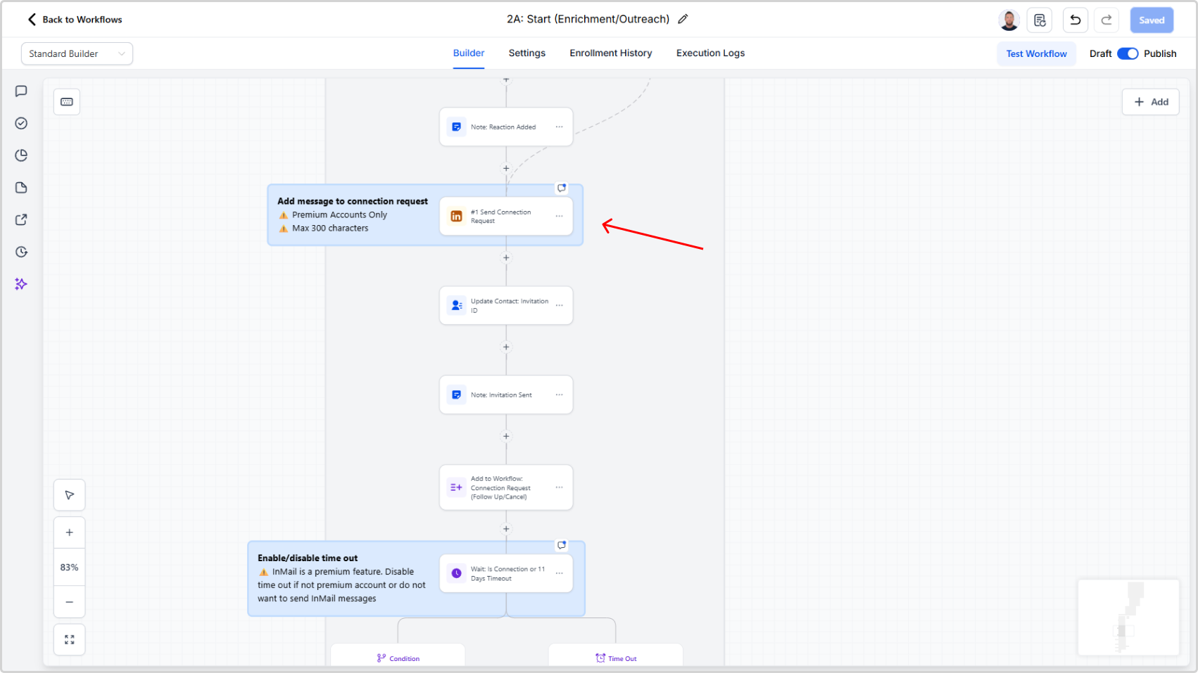 You're configuring how the LinkedIn Outreach workflow sends initial connection requests. This involves setting the post engagement threshold, optionally adding a personalized message (Premium users), and disabling timeouts if needed.