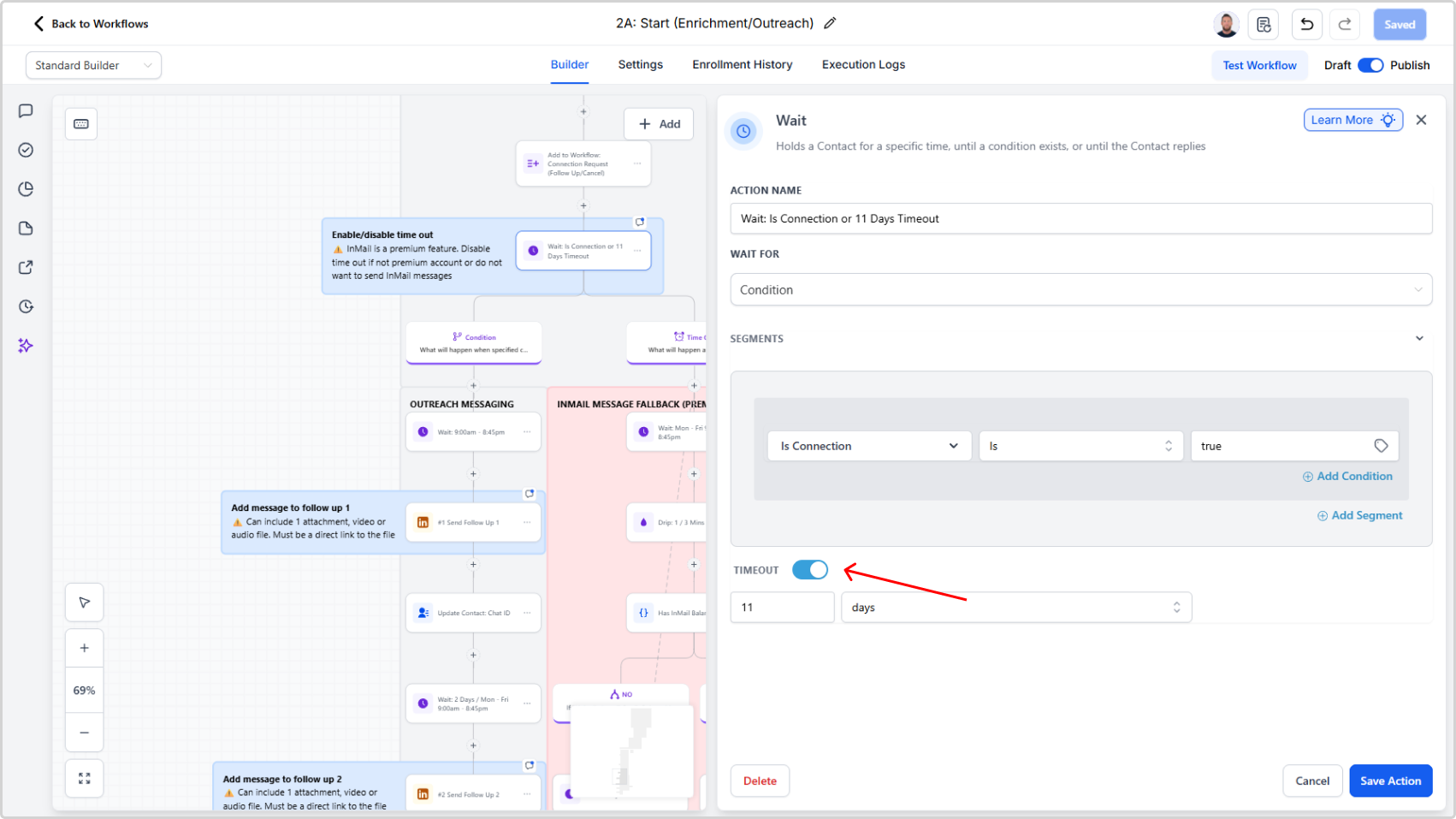 - Locate the wait action "Wait for Connection or [x] Days Timeout"