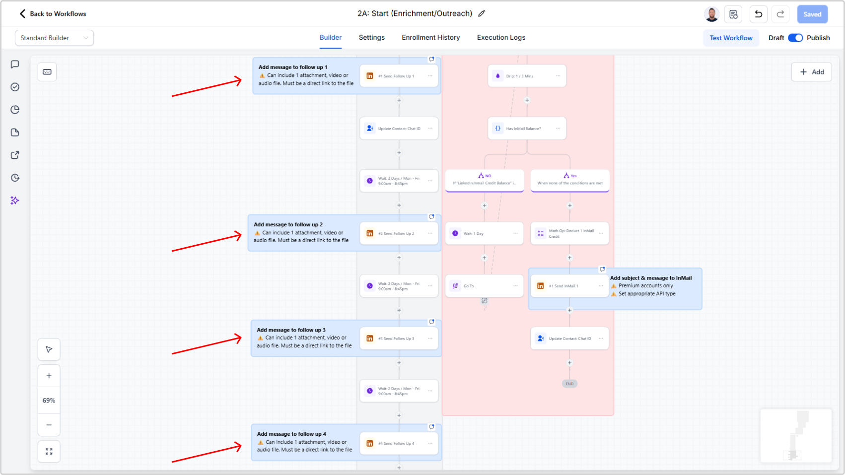 Look for the workflow steps labeled Send Message 1, Send Message 2, etc. These are your follow-up messages.