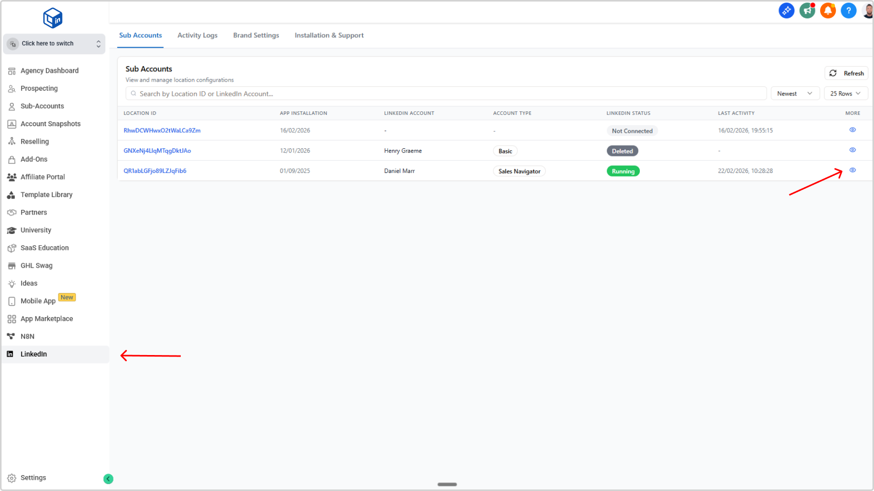 - In your Agency Admin, navigate to the LinkedIn Dashboard